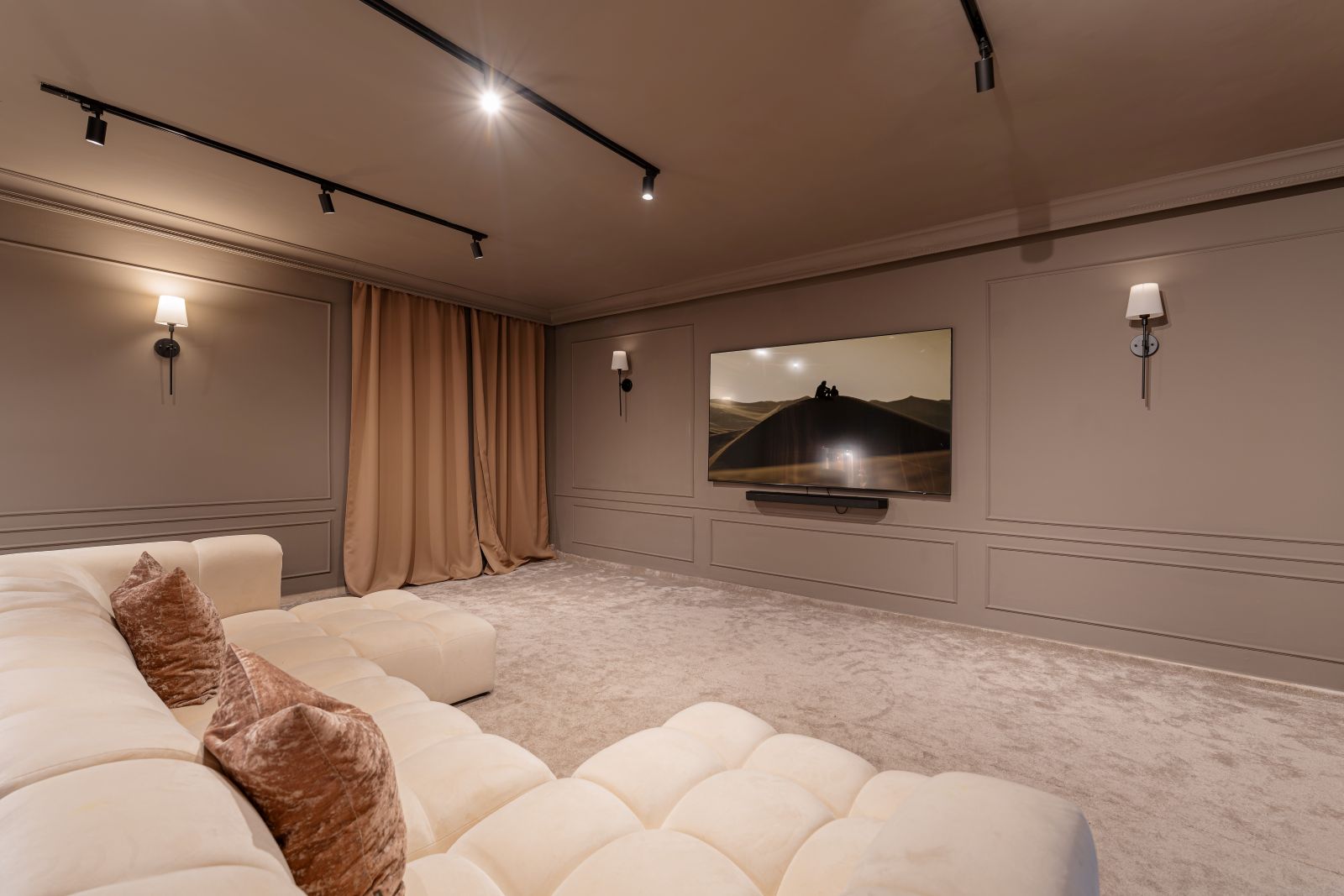Upstairs, the master suite and two bedrooms offer garden views, while the lower level includes a cinema room and guest suite, ideal for entertaining or extended stays.