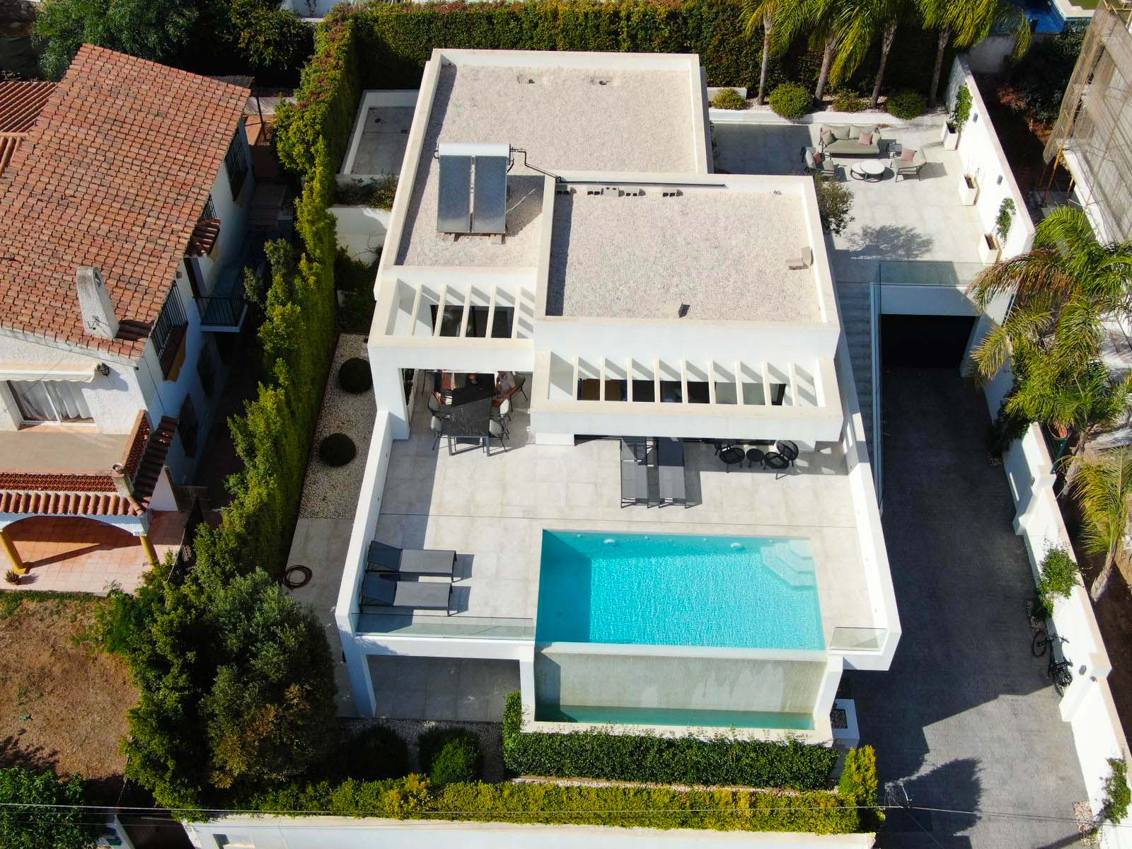 Una villa de nueva construcción con vistas al mar, piscina infinity y terrazas panorámicas, a pocos pasos a la playa.