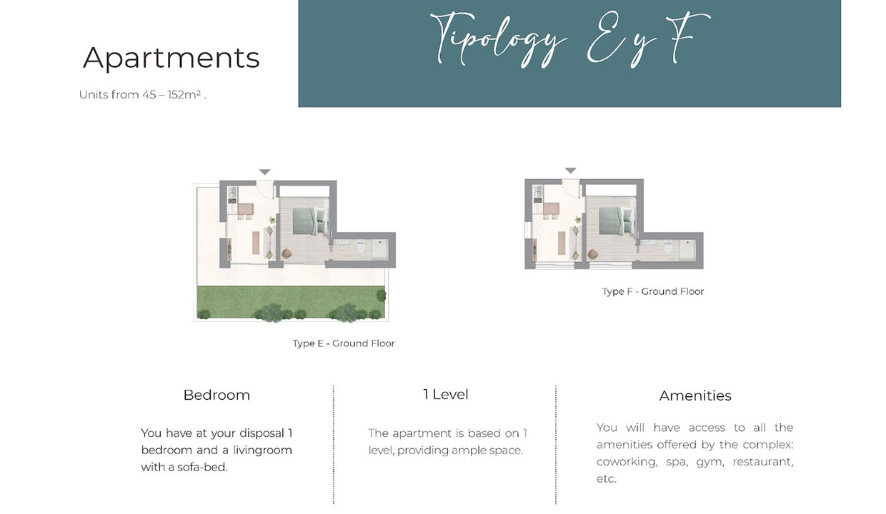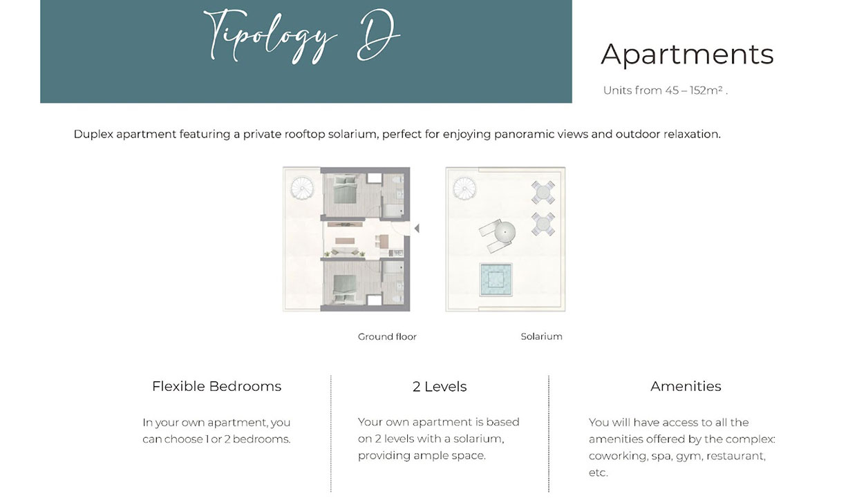 • Diseño de Interiores: Apartamentos y Villas completamente amueblados con diseño funcional, materiales de alta calidad y abundante luz natural.